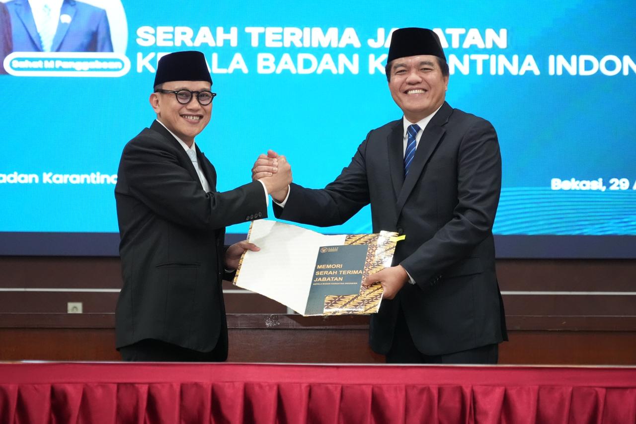 Abdul Kadir Karding resmi menjabat Kepala Badan Karantina Indonesia (Barantin) usai serah terima jabatan (sertijab) dengan Sahat Manaor Panggabean di Auditorium Tagor Sutan Harahap BUTTMKHIT, Bekasi, Jawa Barat, Rabu (29/4).
