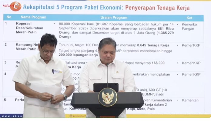 Program penyerapan tenaga kerja pertama, yang disampaikan Menko Airlangga adalah Koperasi Desa atau Kelurahan Merah Putih, yang per 14 September sebanyak 81.487 koperasi telah berbadan hukum.
